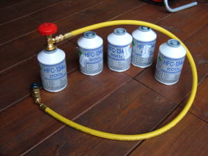 | ガスの補充だけだと、真空ポンプやマニホールドゲージも必要ないので安く上がります。 エアコンガスは1本260円です。 一本だけ補充した時点で、お~冷たい!寒いくらいです! ちょっとガス不足の状態ですが、あまりガスをたくさん入れて圧力をかけると抜けやすくなるので、一本補充で終了。 これで今年の夏は さんごまるも涼しく乗り切れます! |