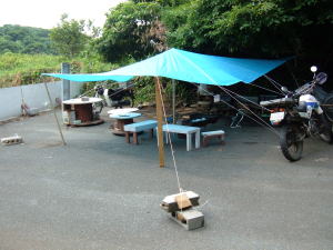 | 大分に住む旅仲間のチッタラさんが神湊で大物を釣りにバイクで来るというので、宴会場の設置です。 今日は昼から雨の予報なので12畳ドカシーを張って雨でも焚き火のできるセッティング~! そして、チッタラさん到着の5分後に雷雨!!間一髪でしたね。 この雷雨の中、たびんちゅや展望サイトでのテント泊はキツイものがあるのでチッタラさんは増設ウッドデッキでテント泊です。 今夜はダッチオーブンパンプキンシチューでご近所さんも交えて夜遅くまで焚き火を囲んでいました。 雨の日の焚き火もなかなか楽しいです。 |