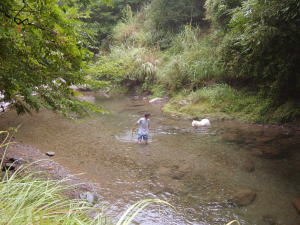| 早速、テントを張ってから、さんごまると川へ突入! つ、冷たい!! 心臓麻痺寸前の冷たさです。 渓谷の水の温度と気温差で、川から白い冷気が上がってる程です。 予想以上に冷たくて泳げません! ここはカンカン照りの真夏日には最適の涼みスポットです。 |