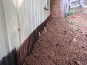 | 先日の大雨で大量の土砂がプレハブと裏山の斜面の隙間に入り込んで、埋まってしまっています。 このままでは、プレハブ外壁の鉄板が錆びてしまうので、隙間にポリカーボネイトの波板を挟み込むことにしました。 |