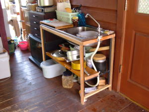 いよいよ、キッチンのリフォームです。 これまでずっと野外用のパイプ組簡易シンクで料理してましたが、嫁さんに急かされて、やっと重い腰を上げてリフォームを決意しました。 先ず、最初に木枠で骨組みを作ります。 |