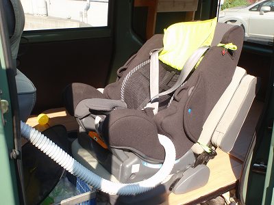 後部座席に設置してあるチャイルドシートにメッシュシートカバーを装着。 これで、寝汗が滝汗のガキンチョ用にメッシュカバーとチャイルドシート背面部分の隙間に冷風を送り込む事が出来ます。 |