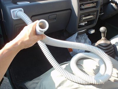 そして、エアコンの送風口とドッキング。 お~!冷たい風がパイプの口から出てくる~ |