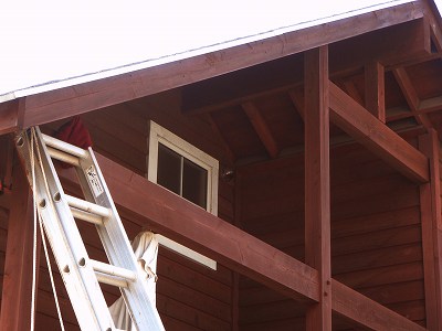 雨の合間を見計らって、日焼けして色が薄くなったお店のケラバを再塗装することにしました。