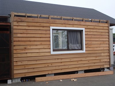 さあ、外壁材を下から鎧張りで貼っていきます。 レッドシダーの外壁材はお店を作るときに余っていたものを使いますが、材料は足りるかな~? |