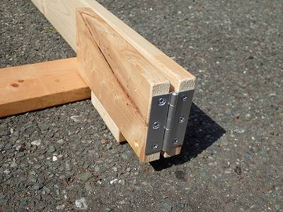 | 中央前方部分の床面への支えは丁番で折り畳み式にしました。 64mm丁番(2枚入):148円なり |