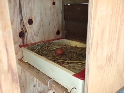 最初の玉子はチョコが自分で巣から蹴り落として割れてしまったので、巣箱のワラをリング状に巻いて落とさないように改良しました。 |